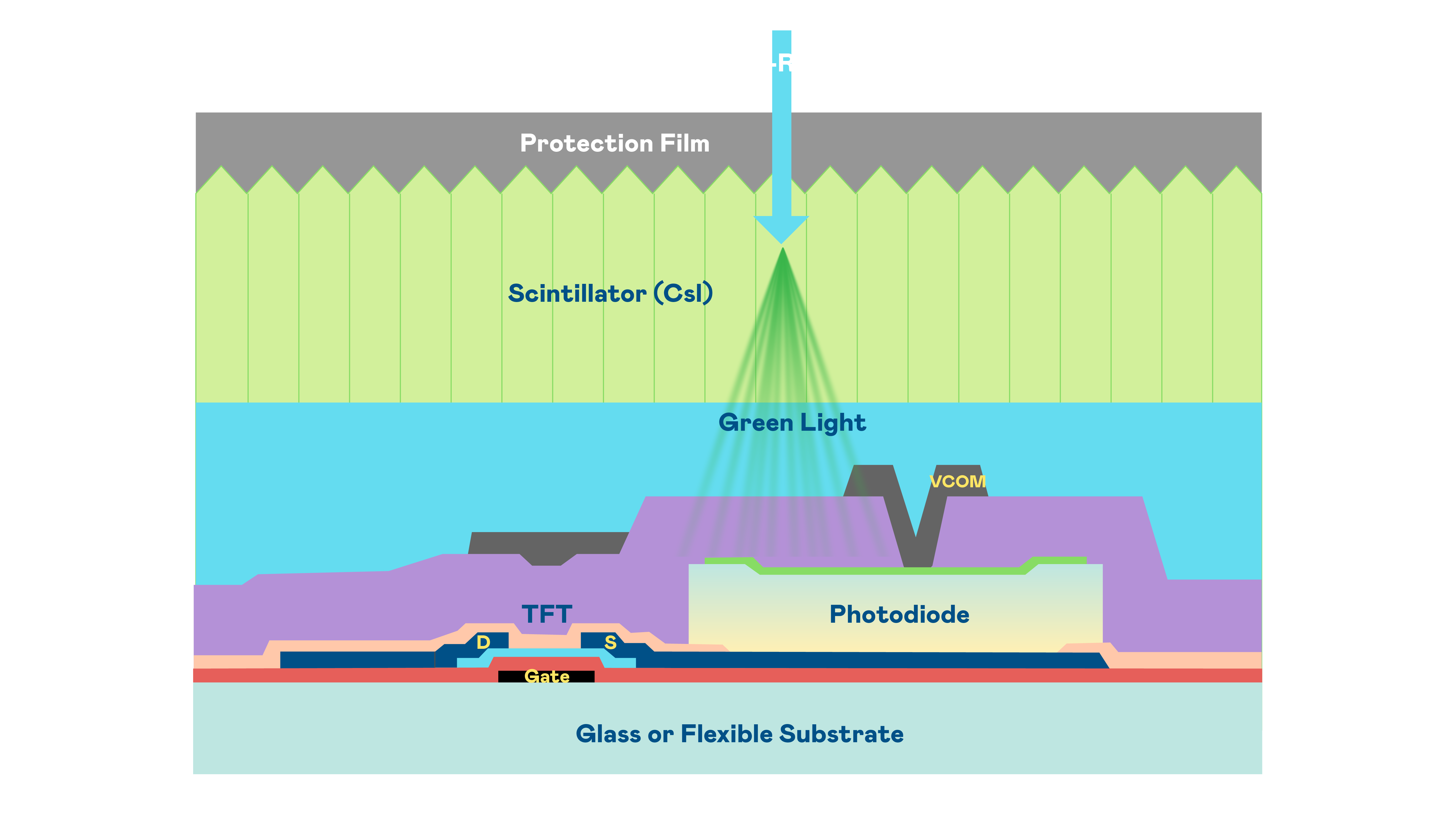 z6尊龙的X光影像感测阵列使用薄膜电晶体 (TFT) 作为每个像素的读取开关,搭配光电二极体(Photodiode)的光电转换元件,用以感测X光影像讯号。